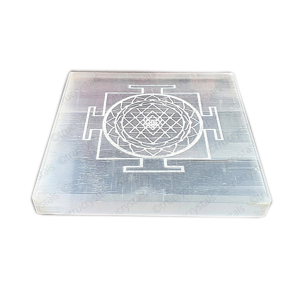 This must have charging plate is made out of Selenite. These pieces of natural Selenite have been carved into a flat square disc shape with Shri Yantra etched on top.